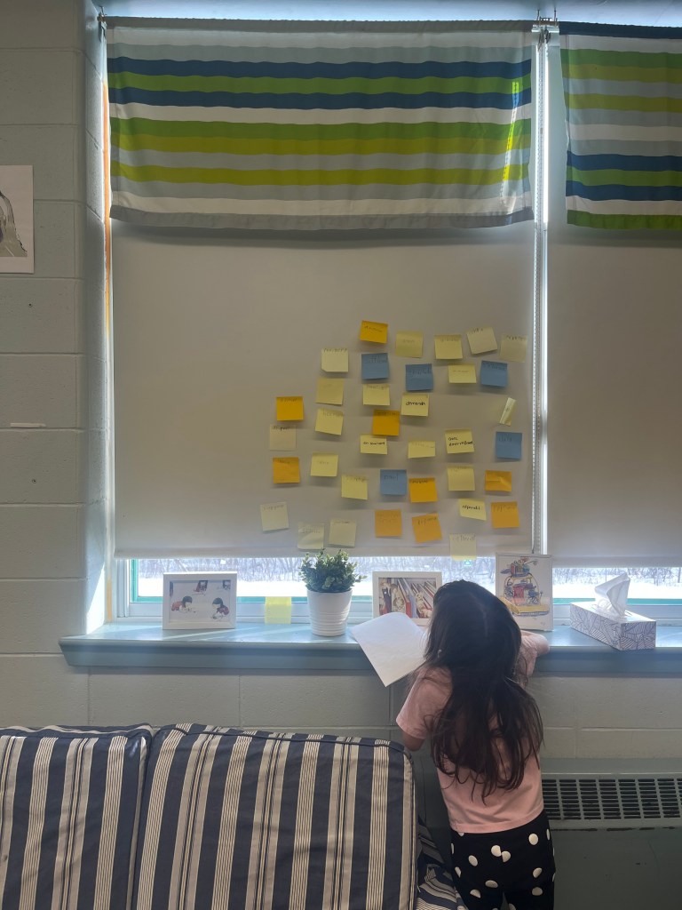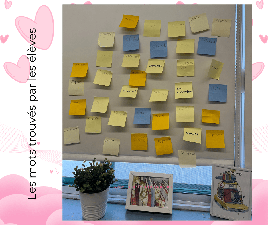 Quel plaisir d’entendre S. s’exclamer: « Oh! On peut aller voir notre tableau des mots de nos livres qu’on a fait hier, et les utiliser dans notre texte! » Ce qu’elle, et plusieurs autres, ont fait durant leur temps d’écriture.