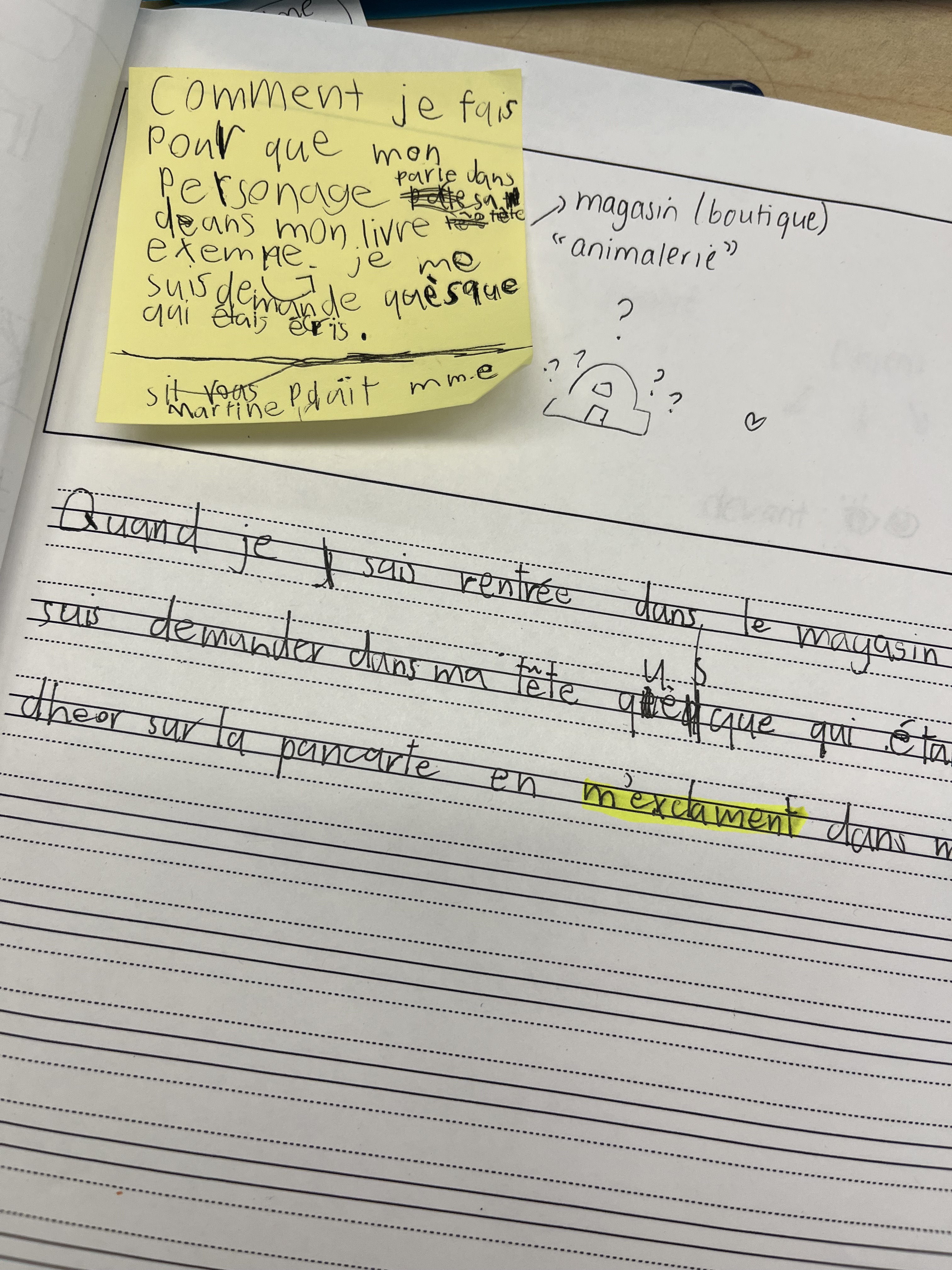 Des questions ont aussi été soulevées durant la période d’écriture autonome. Ici, une question notée dans le texte car j’étais en entretien, donc pas disponible pour cet élève pour le moment. L’élève a noté sa question pour ne pas l’oublier, et sa question a été l’objet de notre enseignement de mi-atelier.