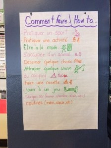 Dans notre classe, l’affichage et les tableaux d’ancrage sont bilingues. Par contre, pour ne pas avoir des murs de classe trop chargés et pour soutenir les élèves dans leur apprentissage de la langue, nous avons décidé de fournir un cartable de mots par équipe, dans les deux langues (mots de vocabulaire classés par thèmes, mots de transition, mots chics, etc.). De plus, pour faciliter l’enseignement et gagner du temps, le livre modèle est toujours le même, donc traduit (par exemple: Par ici la pluie!/Come on, Rain! par Karen Hesse).