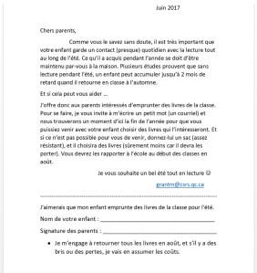 L’important, c’est de mettre les parents dans le coup. Je prends donc le temps de leur écrire, de leur parler de notre plan. Je spécifie aux parents l’importance de lire pendant l’été, en mentionnant que plusieurs recherches abondent dans ce sens. Je leur parle aussi de tout le retard qu’un enfant peut prendre quand il ne lit pas, même les plus doués (le fameux « summer dropout »). Je leur offre la possibilité d’emprunter des livres avec leur enfant. Ils doivent me contacter, prendre rendez-vous, apporter un sac, et, avec leur enfant, faire le choix d’une dizaine de livres. Ils me les rapporteront au début des classes.