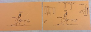 Deuxièmement, il y a la phase du travail côte à côte. L’enseignante aura préalablement écrit un texte du même genre que celui travaillé en classe à ce moment et du même niveau qu’écriraient les élèves ou légèrement plus complexe. Si l’on veut travailler une habileté en lien avec les conventions, notre texte ne doit comporter qu’une seule sorte d’erreurs : celle que l’on veut faire pratiquer aux élèves. Dans le cas où l’on voudrait que les élèves élaborent davantage leurs textes, on écrit un texte avec seulement les idées de base, prêt à être élaboré.