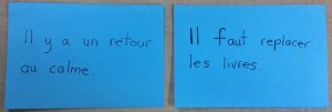 Premièrement, il y a la phase de mobilisation. Il s’agit d’une courte activité (2-3 minutes) en lien avec la stratégie ou l’habileté pour laquelle nous voulons favoriser le transfert. Cette activité se réalisera avec un partenaire (deux équipes de deux élèves). Aussi, l’enseignant doit s’assurer qu’elle sera facilement réussie. L’intention est d’engager les élèves et de rappeler une connaissance en lien avec ce qui sera travaillé. Par exemple, si je veux que les élèves vérifient leur texte et écrivent les sons manquants dans les mots, la phase de mobilisation pourrait être la lecture d’un mot complet au recto d’un carton et le même mot avec un son manquant au verso. Les élèves devront dire de quel côté le mot est complet. Une fois les 2 ou 3 mots complets trouvés, on fait vérifier par l’autre équipe.