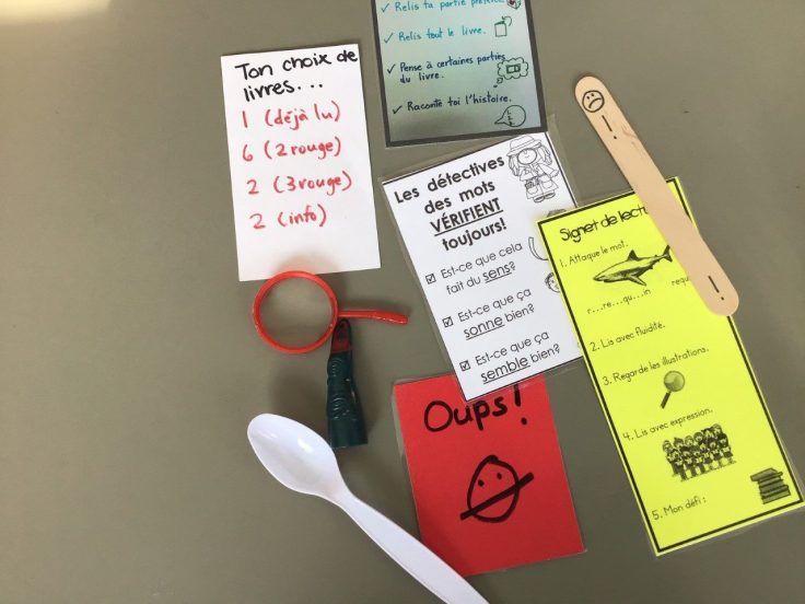 - Différents outils : signet, loupe, petits tableaux d’ancrage, objets pour lire et suivre les mots [par exemple, un doigt de sorcière en plastique], Post Its, crayon, outils suggérés dans les mini-leçons (par exemple la cuillère pour la leçon des « bouchées de mots », etc.)