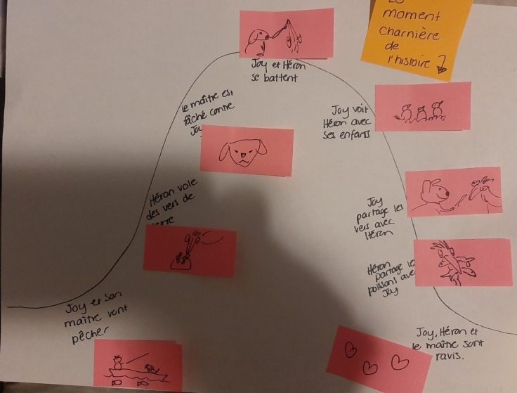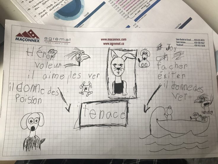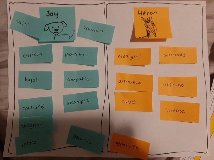 -Il semble y avoir 2 points d’enseignement dans la leçon, deux parties. Une première partie où l’on réfléchit aux caractéristiques des personnages en observant leurs actions et leurs réactions aux situations, leurs interactions entre eux. Et une autre, où les lecteurs révisent leurs pensées au sujet des personnages en découvrant de nouveaux indices et en réfléchissant au moment charnière de l’histoire. Il aurait été bénéfique d’offrir plutôt deux leçons distinctes. (il y a d’ailleurs une 3e leçon dans cette série, non enregistrée, où l’on travaille la courbe narrative et le rappel de l’histoire).