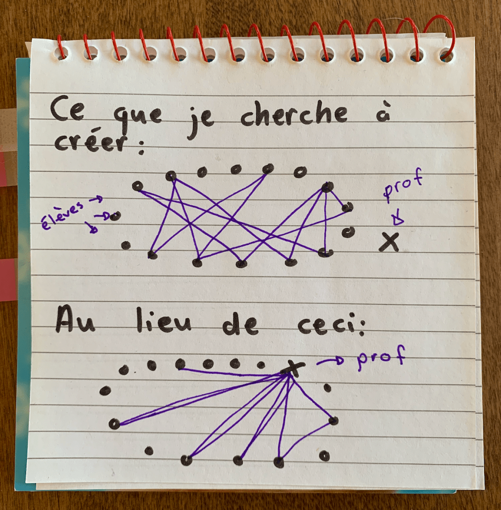 Cette discussion a duré environ 10-12 minutes. Pas plus. Je ne savais pas trop à quoi m’attendre, mais je voulais mettre en place les règles de base. Entre ces dialogues que j’ai notés, il y a eu des élèves qui répétait les idées des autres, d’autres qui changeaient de sujet et que je recadrais en disant : « ça ne poursuit pas l’idée sur laquelle on discute en ce moment, porte bien attention à ce que les autres disent pour faire grandir cette discussion. Mais, somme toute, la discussion avait un bon rythme et était assez fluide. Je pourrais dire que près de la moitié des élèves ont pris la parole au moins une fois.