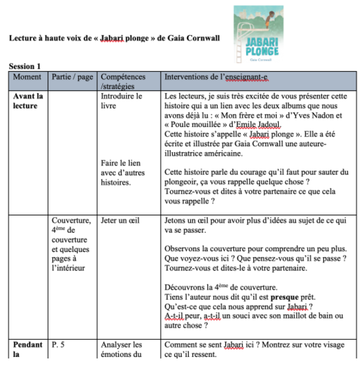 Voici un exemple de préparation de lecture interactive avec le livre Jabari plonge de Gaia Cornwall aux éditions d’Eux.