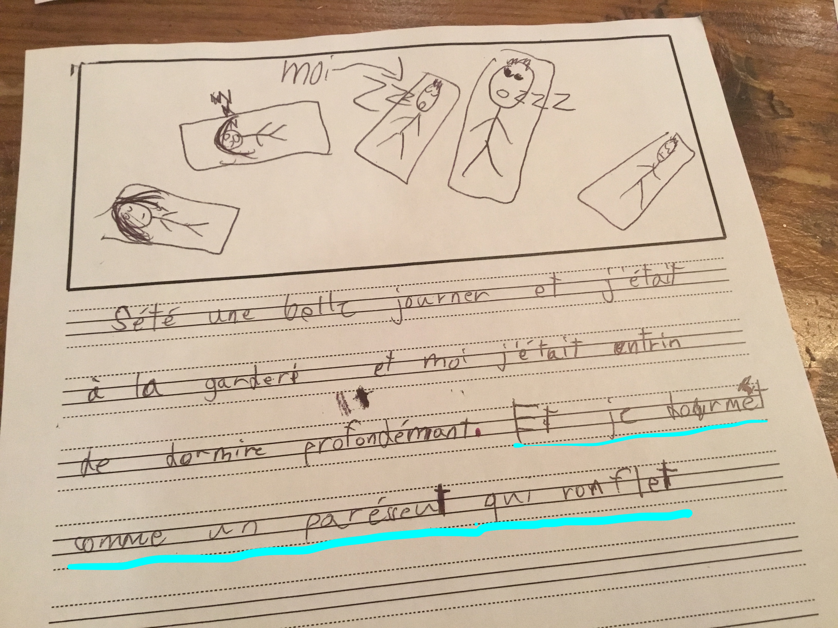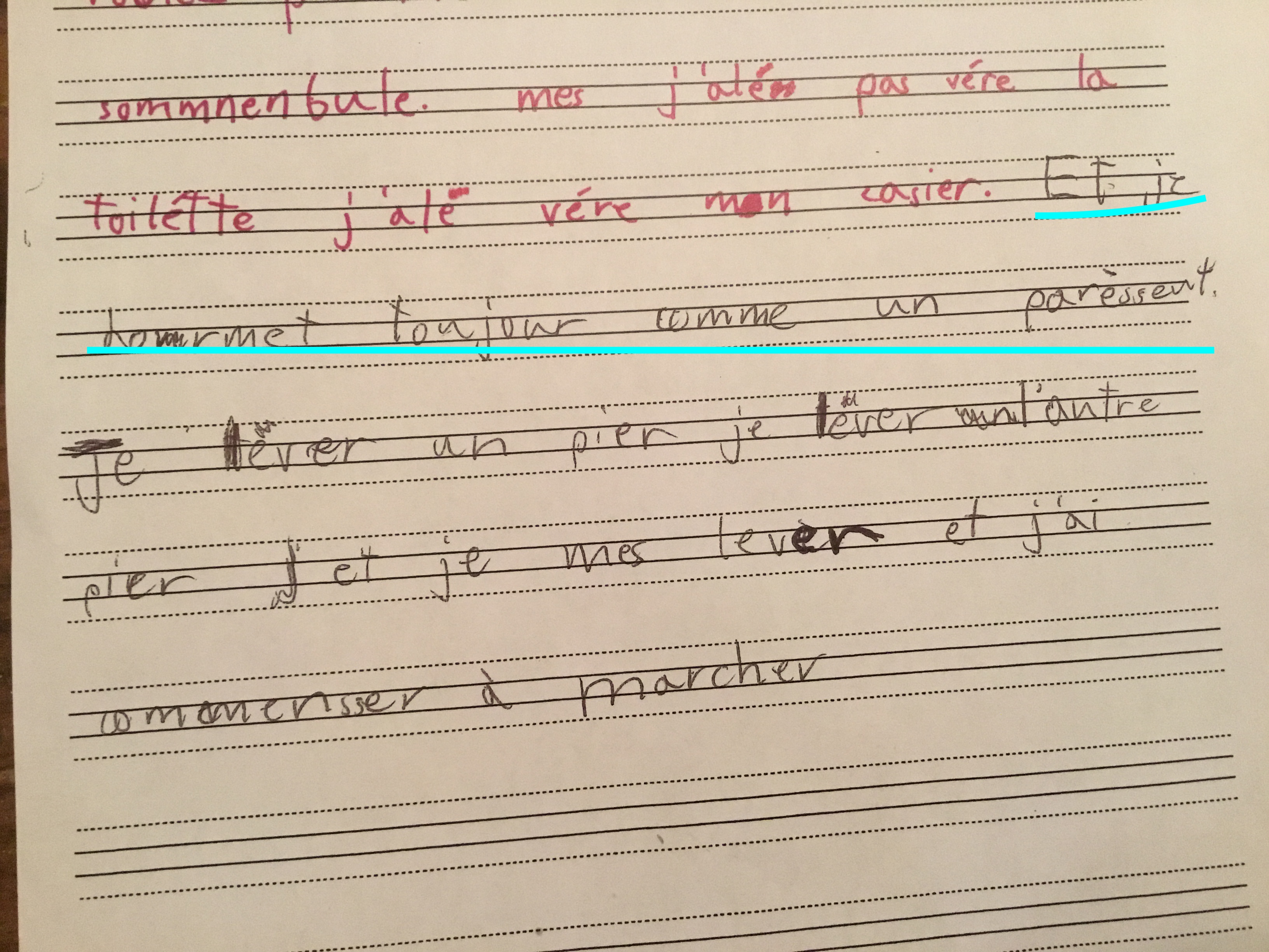 Ce jour-là, j’ai priorisé pour mes entretiens les élèves qui ont le plus d’habiletés en écriture. Même si je recherche toujours l’équilibre dans mes entretiens au fil des jours, ce ne sont pas ces élèves qui sont prioritaires. Certains élèves ont deux entretiens dans un cycle de 10 jours, d’autres, les plus forts, un seul. C’est juste, parce que les besoins sont différents, mais ils ont le droit, eux aussi, d’être amenés à un autre niveau. Et cette leçon est parfaite pour cela. Elle peut être approfondie avec certains.