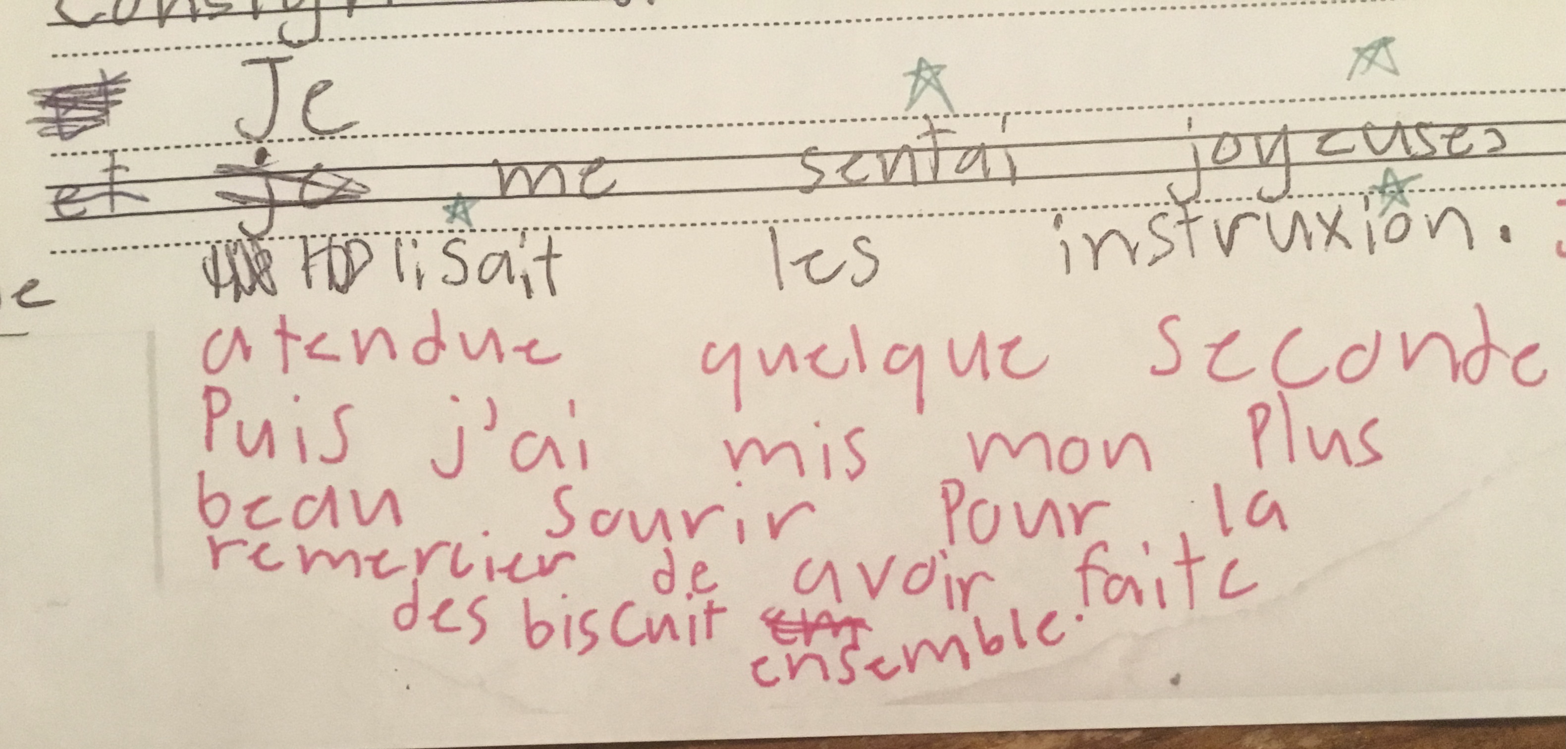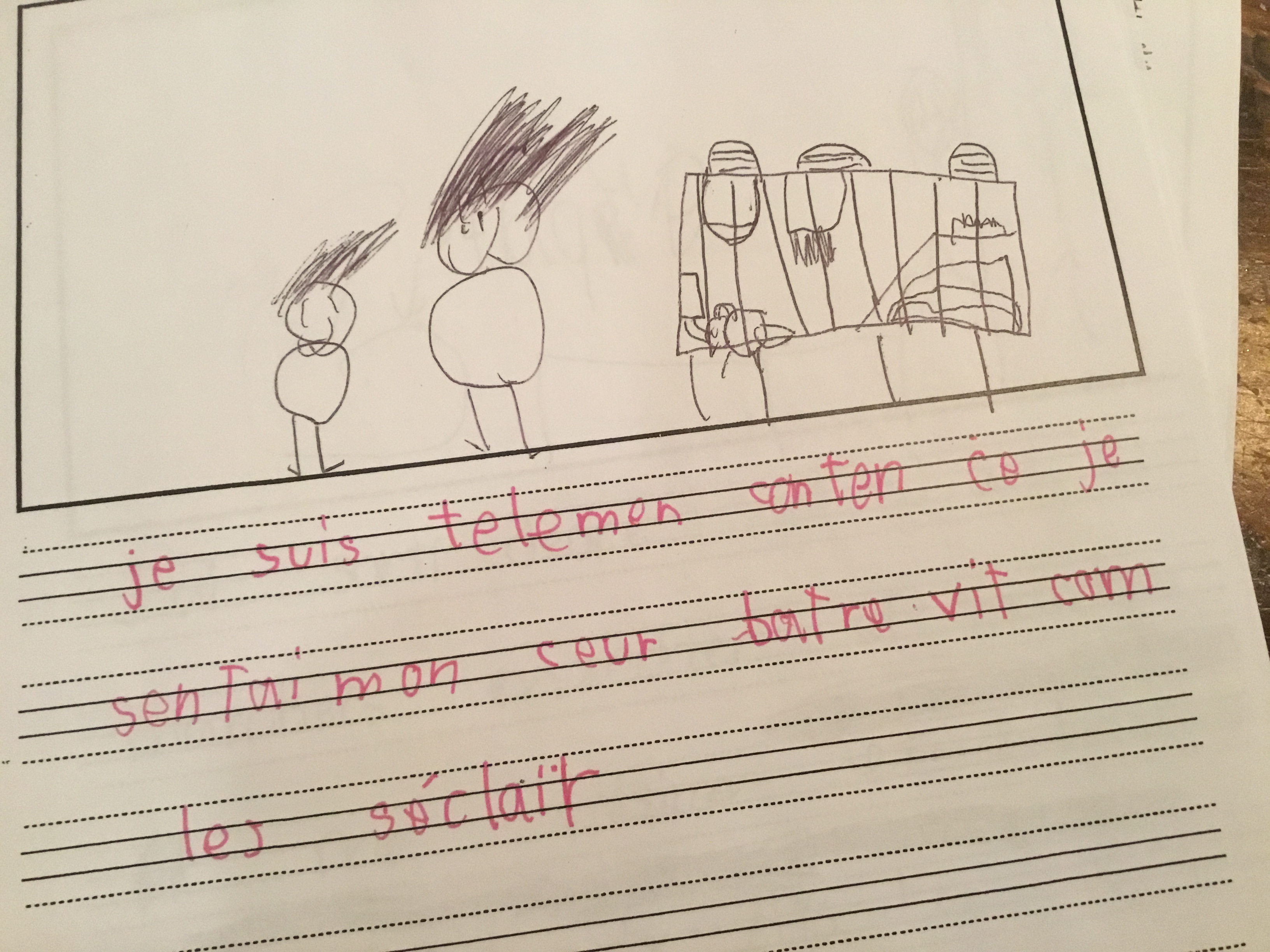 Finalement, chaque élève a choisi une partie dans son texte qui mérite qu’on s’y attarde, en réfléchissant et en faisant des essais pour le choix des mots, en s’inspirant de ce que nous avions découvert et avec l’intention de montrer, par des mots riches qui évoquent des images puissantes, l’importance de cette partie pour tenter de créer eux aussi « un petit quelque chose » dans le cœur de leurs lecteurs.