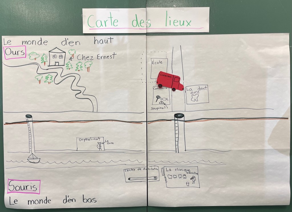Ici, rendre les lieux plus clairs permet aux élèves de visualiser facilement le fil de l’histoire et fait en sorte qu’ils peuvent s’attarder à d’autres aspects du récit. Après tout, pour Le roman d’Ernest et Célestine, ce que je souhaite avant tout est de mettre de l’avant les caractéristiques des personnages et de réfléchir à la relation qu’ils développent ensemble.