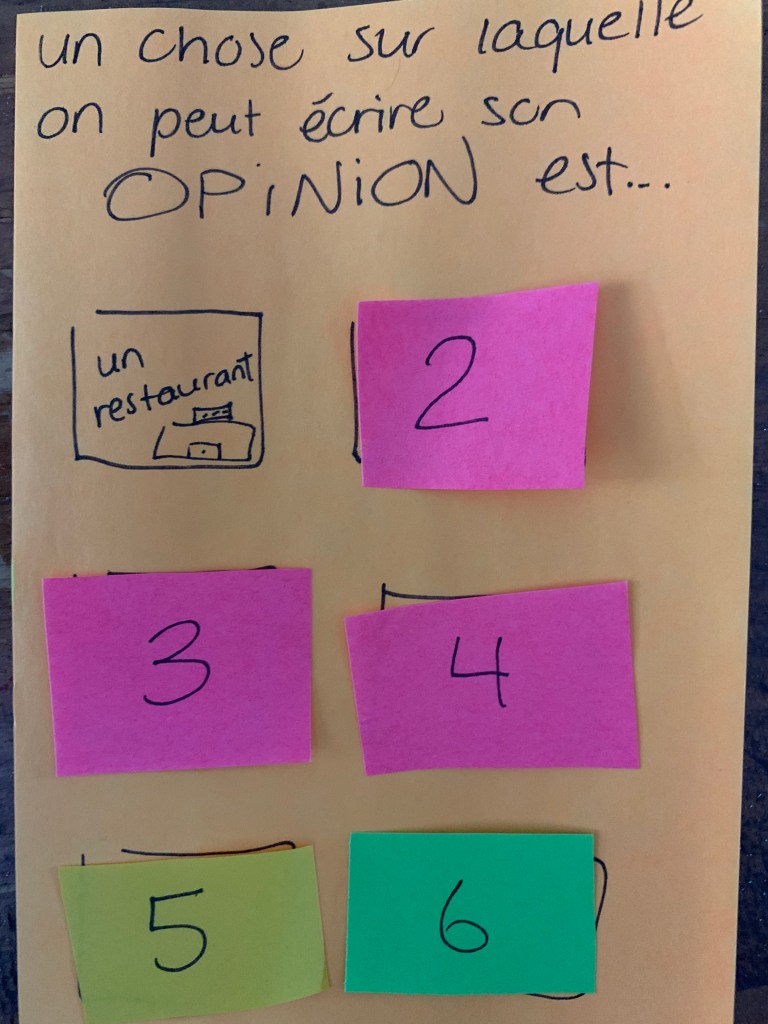 On peut cacher les stratégies enseignées sous des post-it numérotés. Un élève nomme un chiffre, puis donne une idée selon la stratégie qui s’y cache. Les autres élèves notent leurs propres idées, ou la partagent avec leur partenaire oralement.