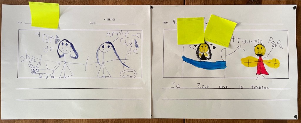 10 septembre: L’élève écrit deux phrases pour raconter et utilise le point pour délimiter ses phrases. (Je suis avec maman et Zachary. Je lis avec maman.)