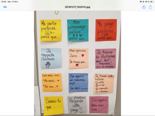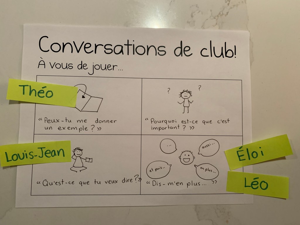 En deuxième année, notre routine du matin commençait toujours par la Jasette du livre, où les élèves discutent du livre lu la veille à partir d’un tableau d’ancrage de sujets de discussion qui s’enrichit au fil du temps et des leçons de lecture. Cela permet non seulement de parler des livres, mais aussi de favoriser un engagement dans la lecture à la maison. On a une obligation envers son partenaire!