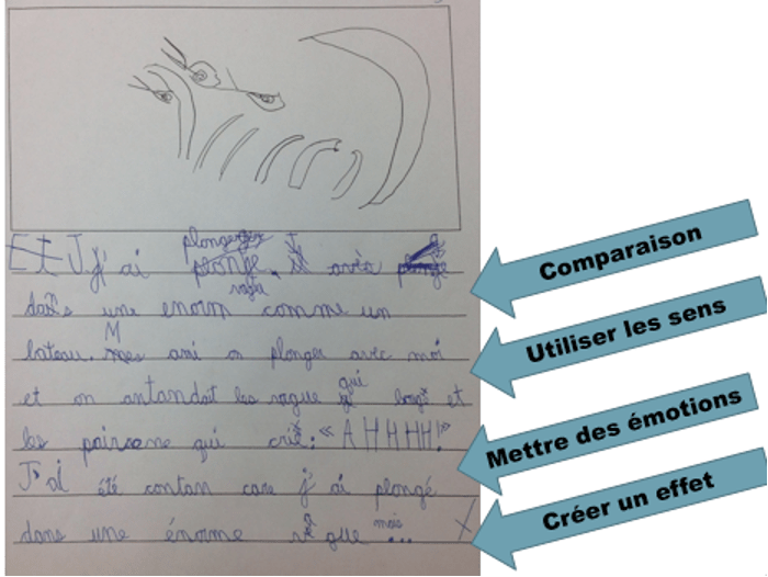 Un élève du 1er cycle appose des autocollants aux endroits où il a utilisé les stratégies enseignées. Dans ce cas-ci, il a intégré des paroles, une émotion et il a ajouté une phrase pour montrer l’émotion et non seulement la dire.