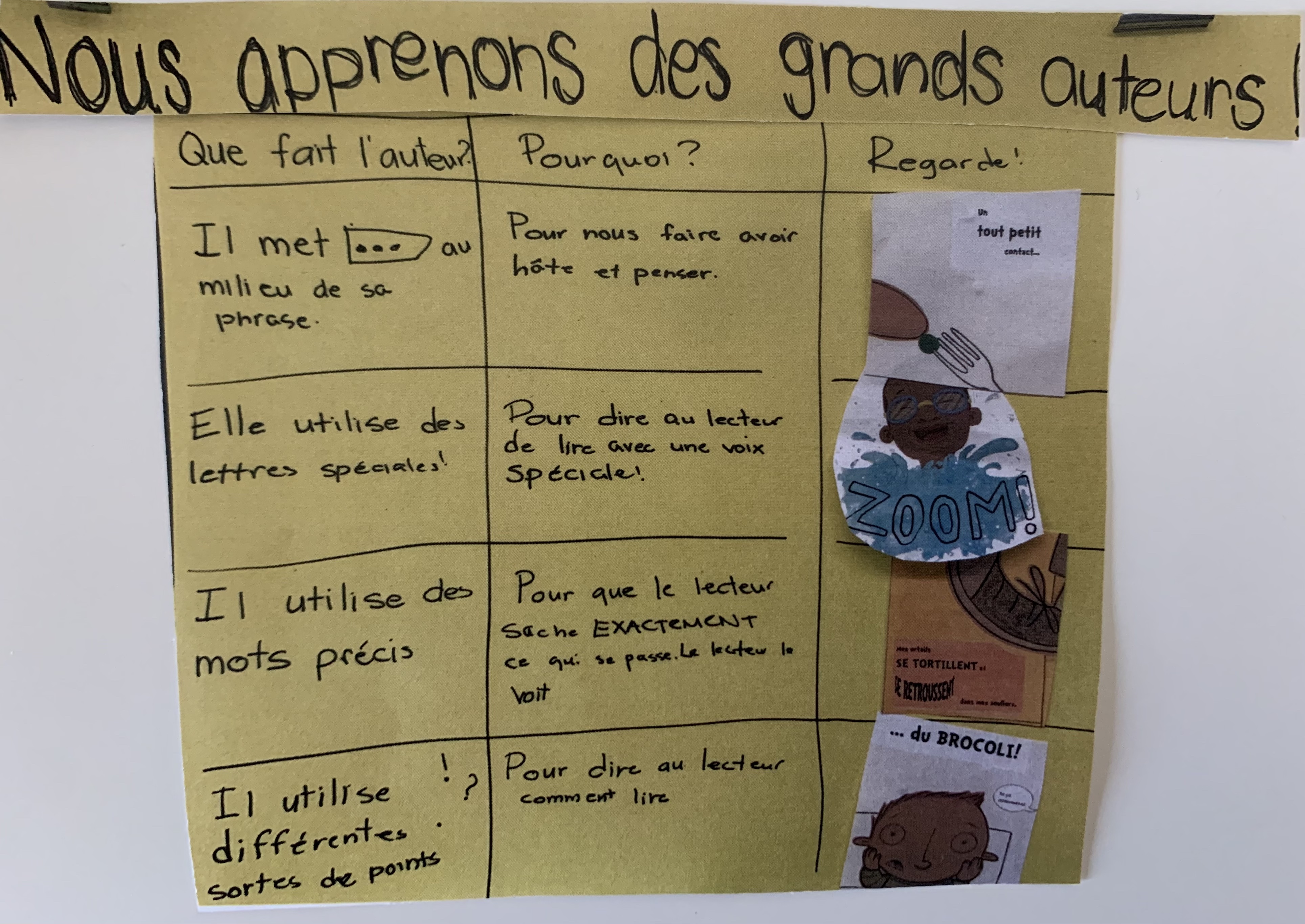 Chaque élève a choisi une copie de l’un des tableaux d’ancrage de la classe, résumant plusieurs leçons enseignées, qu’il a pu annoter à sa façon (certains encerclent les stratégies révisées, d’autres font des « X » quand ils ont utilisé ou ajouté la stratégie dans leur texte…). Les copies de tous les tableaux sont aussi accessibles, après la leçon de révision, au coin écriture. Des élèves vont en chercher un autre, et un autre, pour poursuivre la révision. Chacun a aussi reçu un post-it de chaque forme proposée pour marquer son texte. Ils ont aussi accès aux outils de révision habituels comme le ruban adhésif, les bandes de révision et un crayon d’une couleur différente, et d’autres exemplaires des post-its. Les tableaux d’ancrage (Le processus d’écriture, Comment rendre ton histoire plus vivante, S’inspirer des grands auteurs, Comment écrire un mot) sont toujours affichés dans la classe. Ils sont invités à se lever, à venir les consulter en révisant.