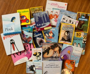 Ensuite, ce sera la lecture/écriture autonome. Ils ont eu une belle surprise en venant chercher leurs effets hier: de nouveaux livres dans le sac de lecture, des documentaires! Ils ont aussi des livrets agrafés pour de nouveaux textes.