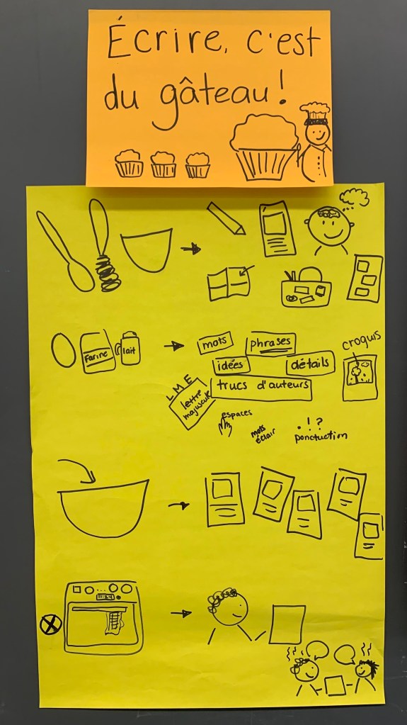 Cette semaine, j’ai commencé ma leçon de révision en racontant que la veille, j’avais préparé gâteau avec ma fille (mes élèves savent déjà que nous cuisinons souvent ensemble, et qu’elle est une excellente cuisinière). Que nous avions sorti bols, cuillères, mélangeur, tasses à mesurer et moule, puis rassemblé les ingrédients. Ensuite nous avons mélangé les ingrédients, versé la préparation dans le moule et mis au four. Qu’après 25 minutes de cuisson, nous l’avions sorti, laissé refroidir, décoré et dégusté en famille. Et qu’il était délicieux! Ensuite, je leur ai dit que ce moment m’avait fait penser à leur travail d’auteur et d’autrices. Que je voulais leur enseigner que , comme dans la préparation d’un gâteau, toutes les étapes sont importantes quand on prépare un texte. Nous avons bâti ensemble un tableau d’ancrage pour chacune des parties, en y inscrivant l’étape de préparation du gâteau et l’étape du processus d’écriture correspondante.
