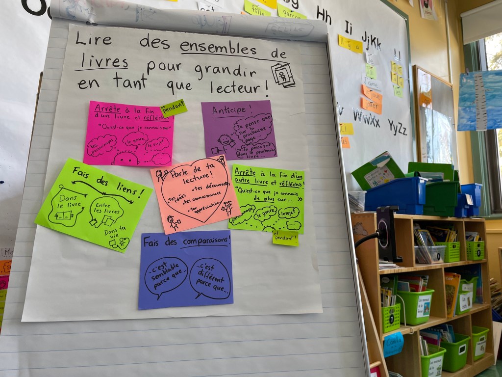 Évidemment, il ne s’agit pas que d’offrir aux élèves des ensembles de livres pour développer une compréhension plus approfondie de la lecture. Ils ont besoin qu’on leur enseigne ce qu’ils peuvent faire et la manière d’y parvenir. La meilleure façon demeure le modelage. Choisir un ensemble de livres pour nos leçons, lire avec les élèves et s’arrêter pour mettre des mots sur ce qu’on fait dans le but d’approfondir notre compréhension est essentiel. Il est aussi important de laisser des traces de nos stratégies sur un tableau d’ancrage afin de favoriser le transfert, d’offrir du temps de lecture et d’offrir des moments fréquents d’échanges et de discussions entre les lecteurs.