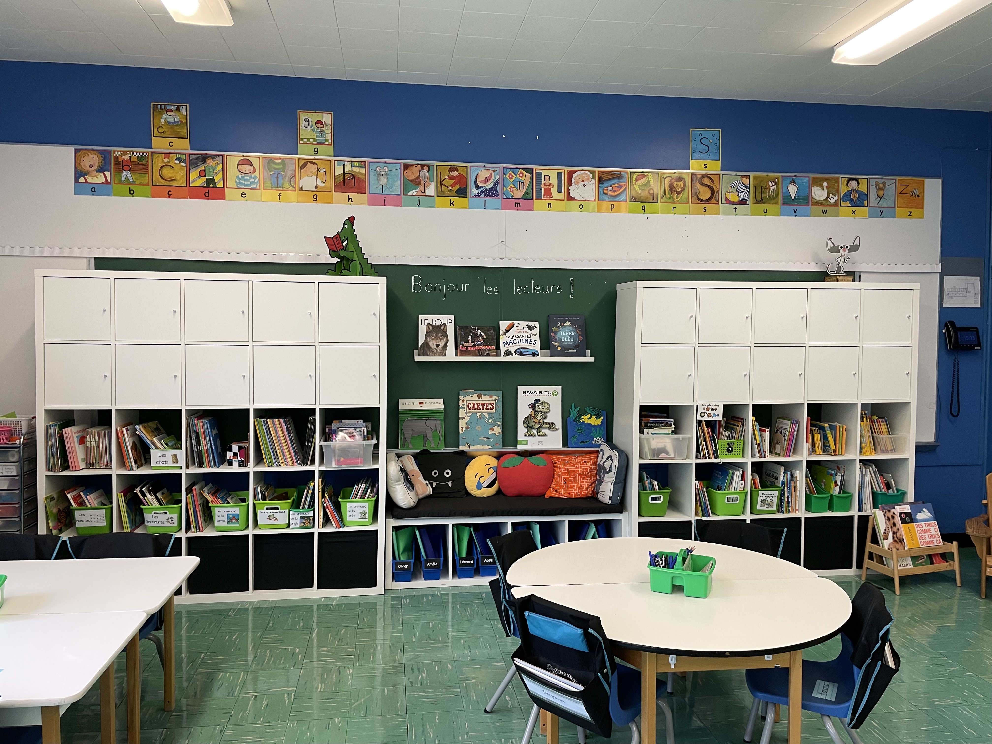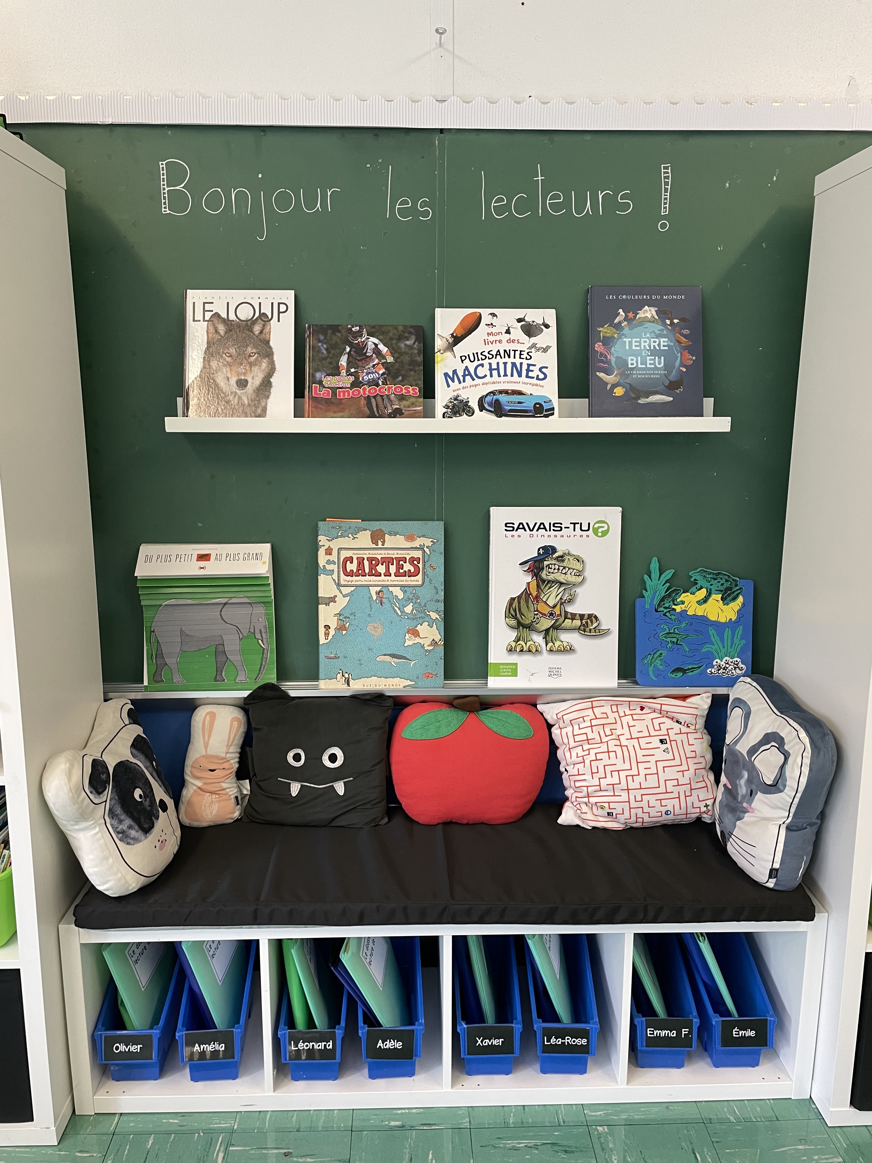 - Des livres partout! Un environnement littératié riche dans lequel les livres sont mis en valeur dans différents espaces pour qu’on sente bien qu’ils sont essentiels à la vie de la classe;