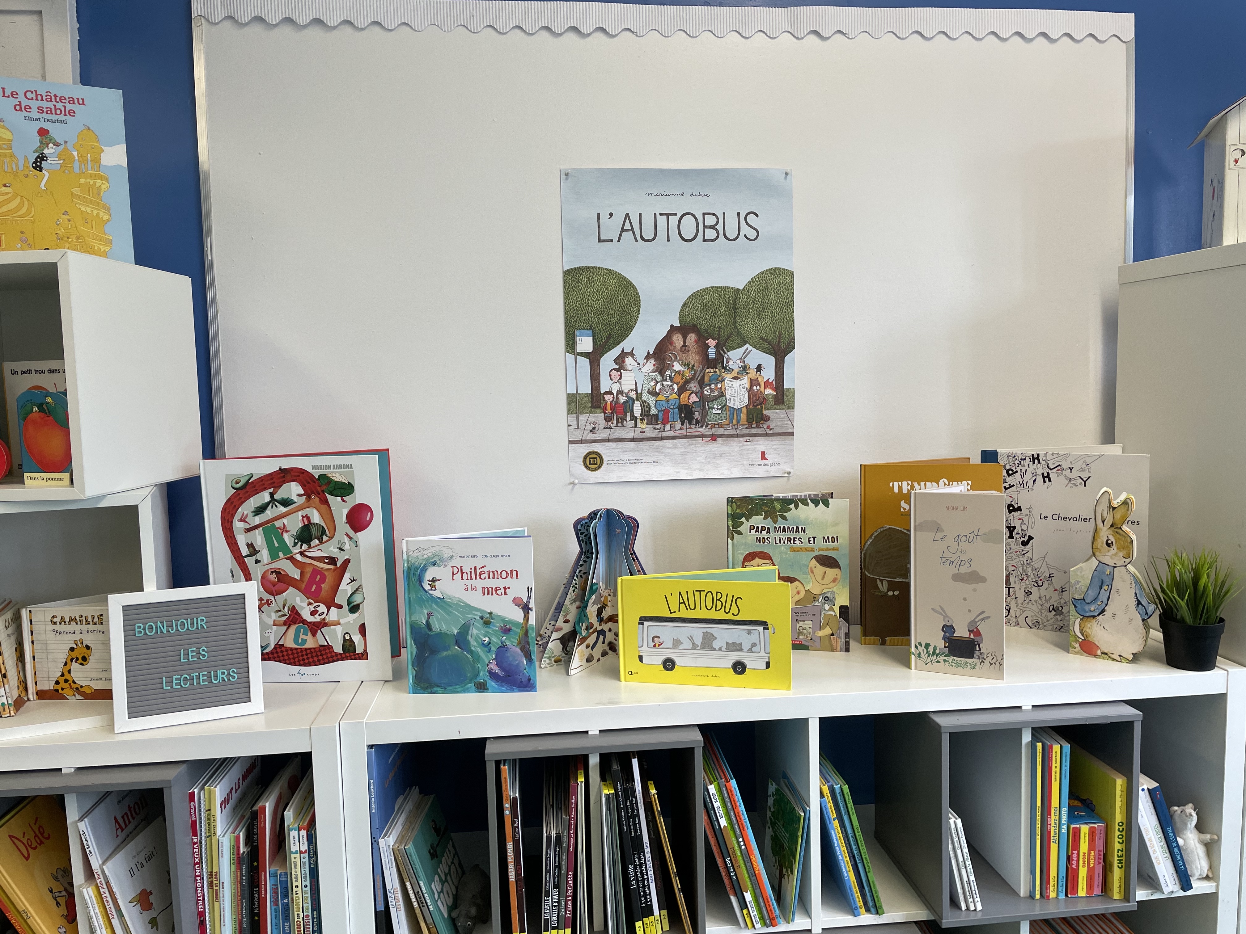 - Des bibliothèques distinctes dédiées aux documentaires, aux albums, aux romans et aussi un endroit prévu pour les autres types de livres qui apparaitront au fil de l’année (BD, poésie…);