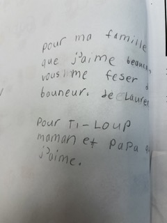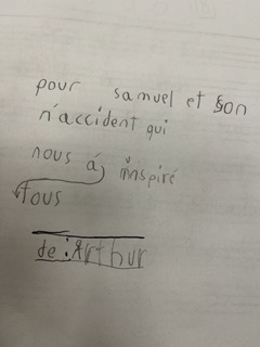 Pour préparer le texte choisi à être publié pour la célébration, les élèves étaient invités à revoir leurs pages pour décider lesquelles mériteraient d’être recopiées pour s’assurer que le lecteur puisse lire leur histoire facilement. La plupart des élèves ont choisi de recopier une page. Pour certains, ce n’était pas nécessaire, et pour d’autres, tout le texte a été recopié. Le jugement de chaque auteur est pris en considération pour cette étape, comme pour les autres étapes du processus d’écriture. Durant l’année, recopier au propre n’est pas toujours nécessaire pour la célébration choisie, et jamais pour tous les textes produits. Il faut toujours avoir son objectif en tête : voir le « avant-après », qui peut montrer à certains l’avantage d’écrire lisiblement et proprement même pour soi, rendre un passage lisible pour le lecteur, afin qu’il puisse apprécier la qualité de nos stratégies d’écriture, juste rendre le produit fini « plus beau »? Et varier les demandes ou exigences en ce sens durant l’année.