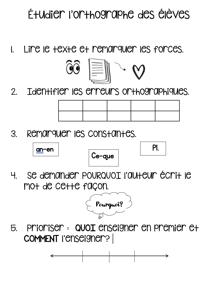 Pour choisir les éléments à corriger, il faut penser aux attentes de notre niveau scolaire selon notre programme d’étude, à ce que nous avons enseigné, et à la progression du développement de l’écrit. Nous pouvons aussi étudier les textes de nos élèves pour relever les constantes à enseigner et à réviser, et cibler ces éléments pour l’étape de correction. Cela pourra aussi nous aider à décider de la modalité d’enseignement : en groupe, en petit groupe ou individuellement.