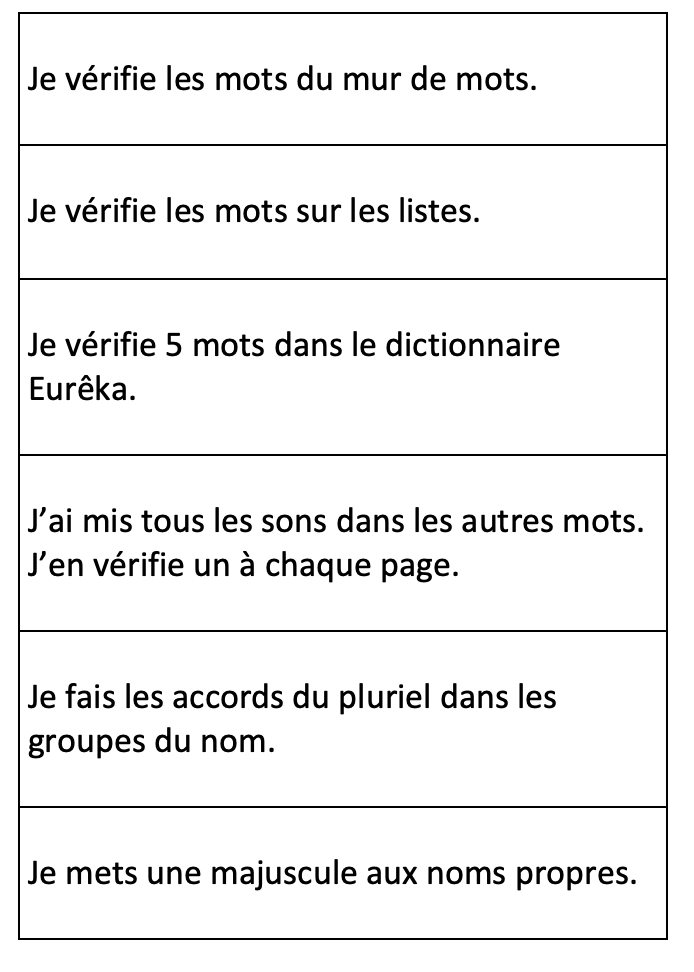 Nous pouvons cibler un aspect précis de la correction pour une semaine ou une journée précise et l’indiquer dans le tableau d’ancrage du processus d’écriture. Par exemple, nous pourrions dire : « Cette semaine, lorsque vous êtes rendus à l’étape de correction, vous pourriez vérifier s’il n’y a pas de lettres majuscules au milieu des mots. » ou « Cette semaine, nous avons travailler les accords dans le groupe du nom, n’oubliez pas de vérifier cela lorsque vous corrigez votre texte! ». Isoler un aspect permet un meilleur focus (Brissaud et Cogis, 2001).