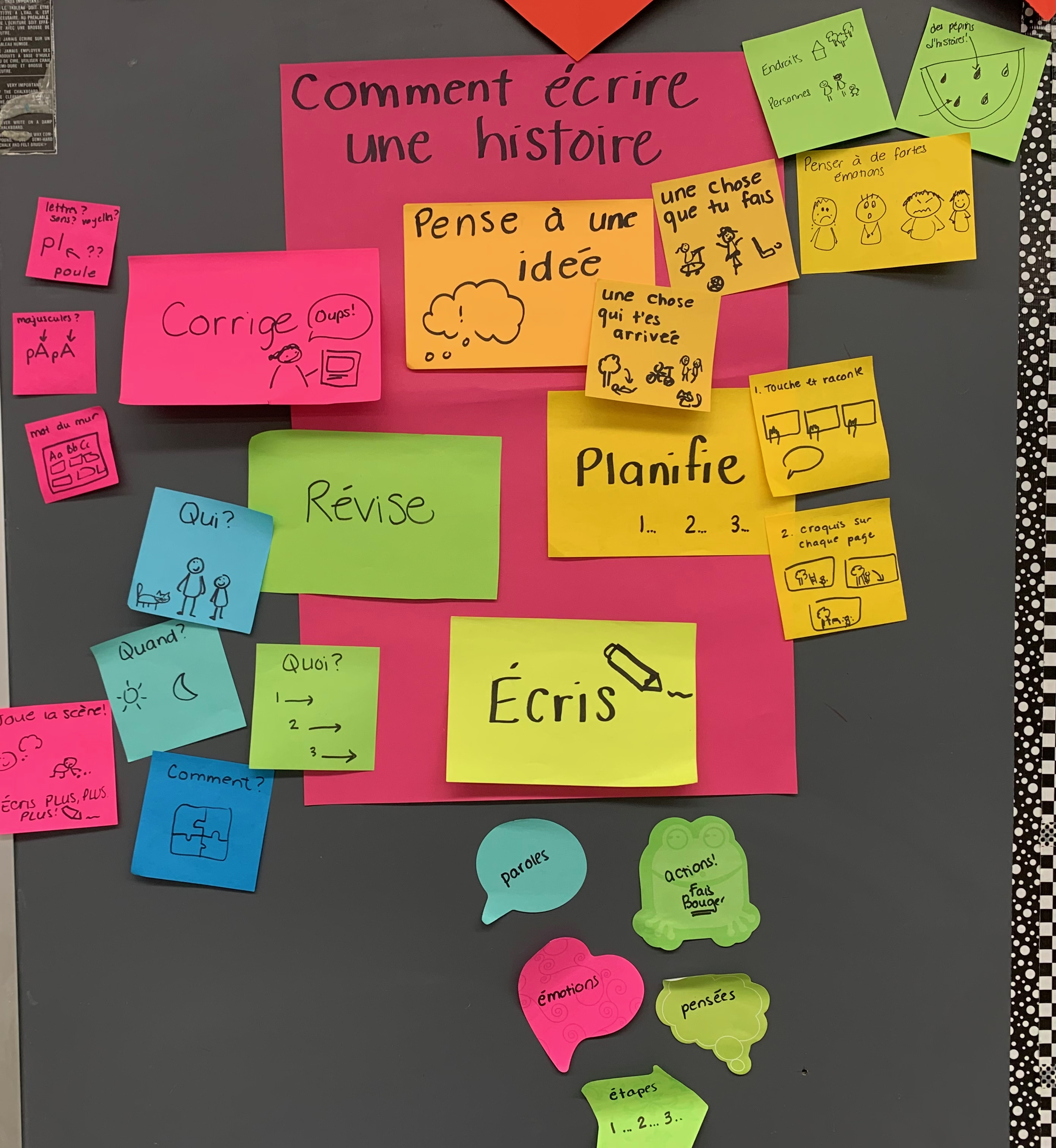 Aussi, nous devons penser à intégrer l’étape de correction à d’autres moments dans la journée. Dans les modules d’enseignement de l’atelier d’écriture, il y a quelques ateliers où nous nous arrêtons avec les élèves pour cibler la correction, mais trop peu. Nous devons inviter les élèves à le faire plus souvent, et ce, durant l’atelier d’écriture (par exemple durant l’enseignement de mi-atelier ou la mise en commun), mais aussi en dehors de l’atelier d’écriture.