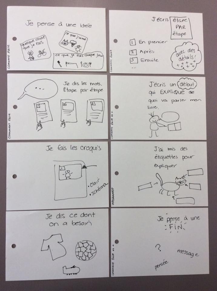 Une fois les premiers ateliers passés, au fur et à mesure que nous apprenons à connaitre nos élèves et leurs besoins comme auteurs et comme lecteurs, les outils tactiles et visuels sont d’une aide précieuse pour les aider à penser à ce qu’ils ont à faire et à se mettre en action. Ils sont utiles pour donner un coup de pouce extrinsèque à la motivation en attendant que les élèves deviennent assez habiles avec une procédure pour la faire de façon autonome.