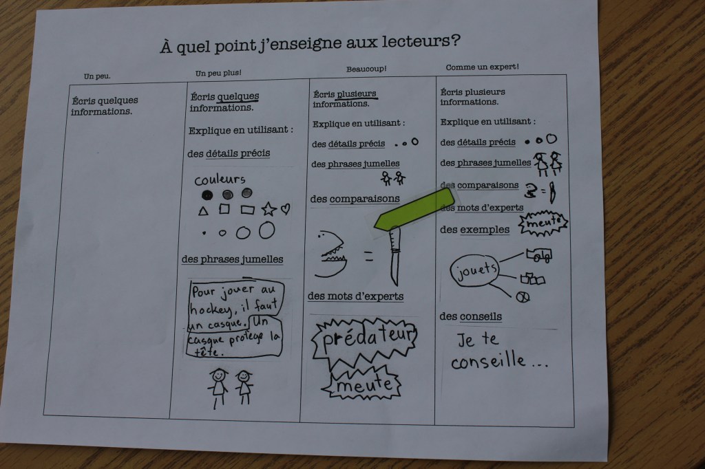 On peut présenter un outil lors d’une mini-leçon, d’un enseignement en petit groupe, ou d’un entretien individuel. On a aussi avantage à utiliser un outil déjà présenté à la classe lorsque nous travaillons en petit groupe ou individuellement avec un élève. La répétition permet une meilleure compréhension et un meilleur transfert. Et d’abord et avant tout, comme l’a si bien mentionné Rebecca Cronin il y a quelques années alors que j’assistais à mon premier institut en enseignement de l’écriture au Teachers College: « Un outil est comme une béquille. Lorsque nous présentons un outil, nous devons penser: à qui il sera utile, pourquoi il sera utile et surtout… quand et comment je vais le retirer pour que l’élève devienne autonome avec la stratégie. C’est le but de notre enseignement! »
