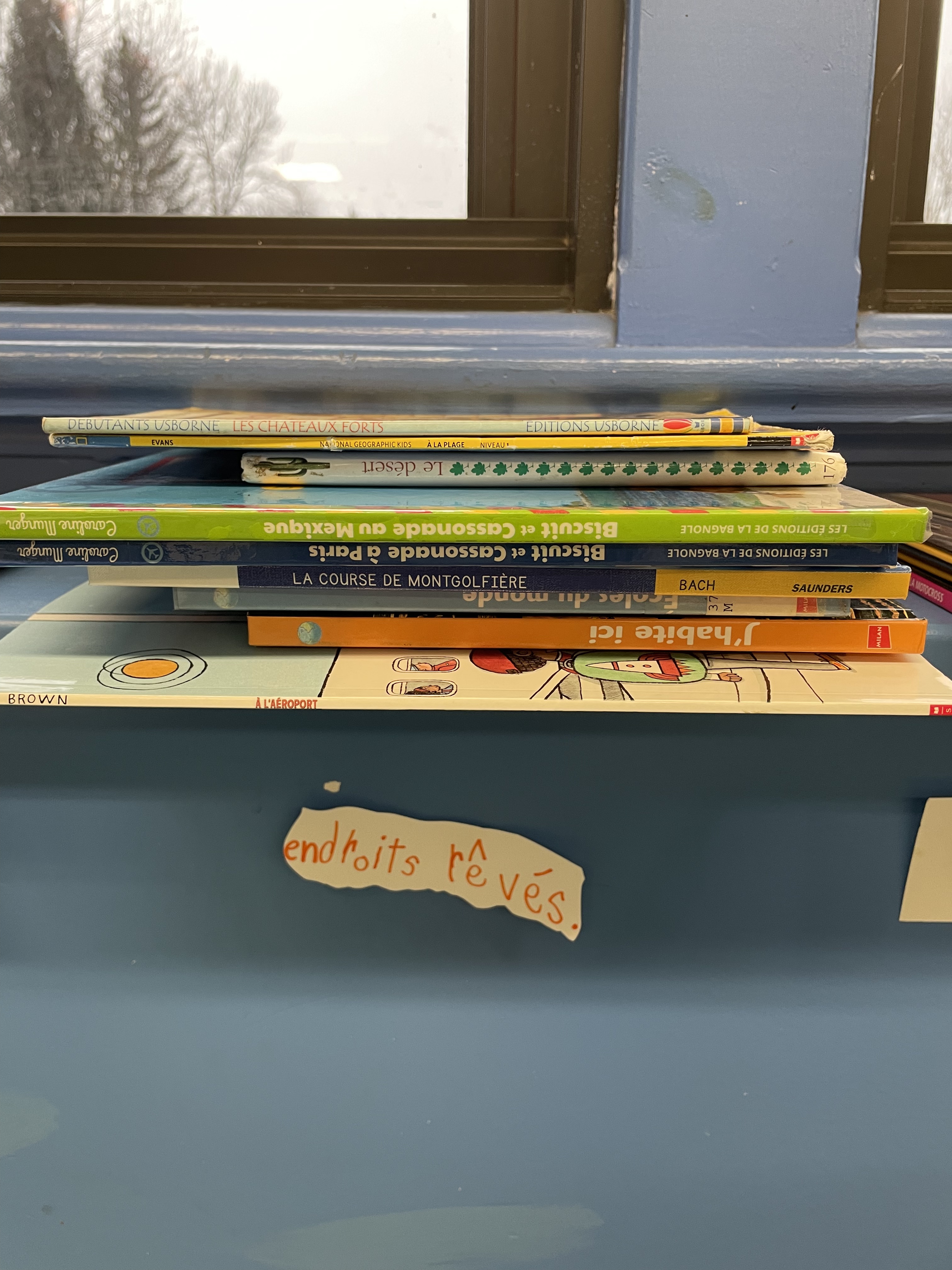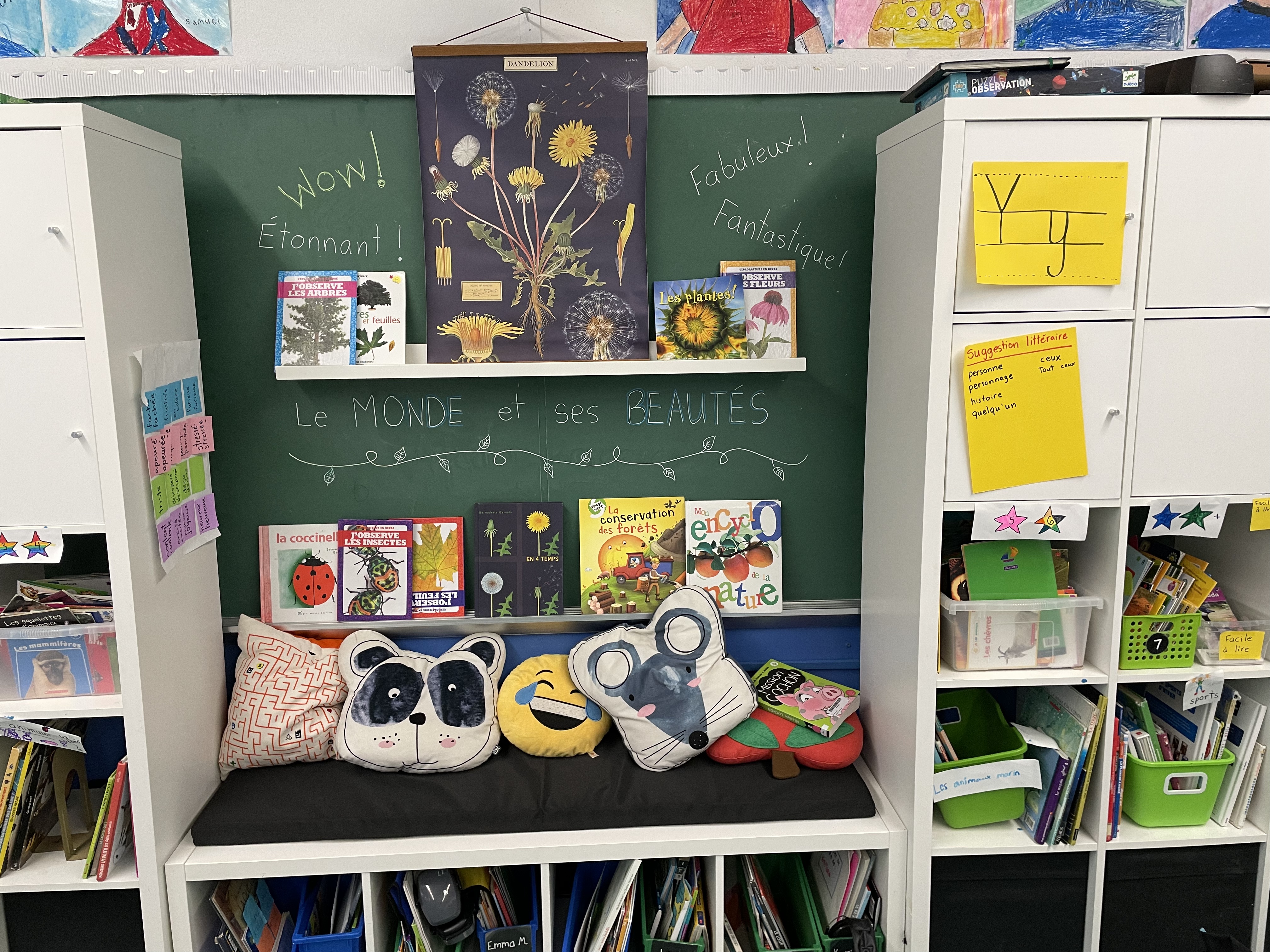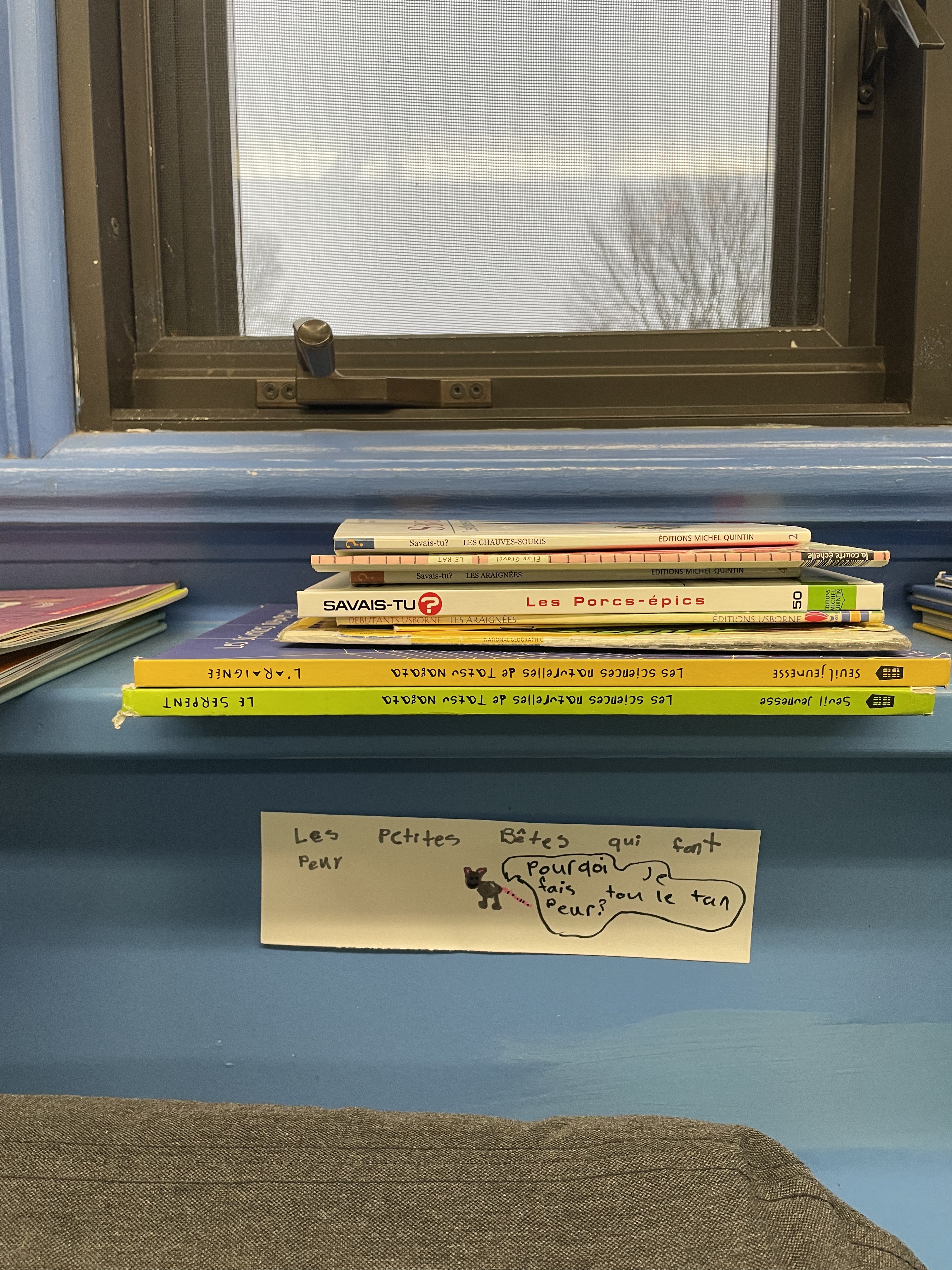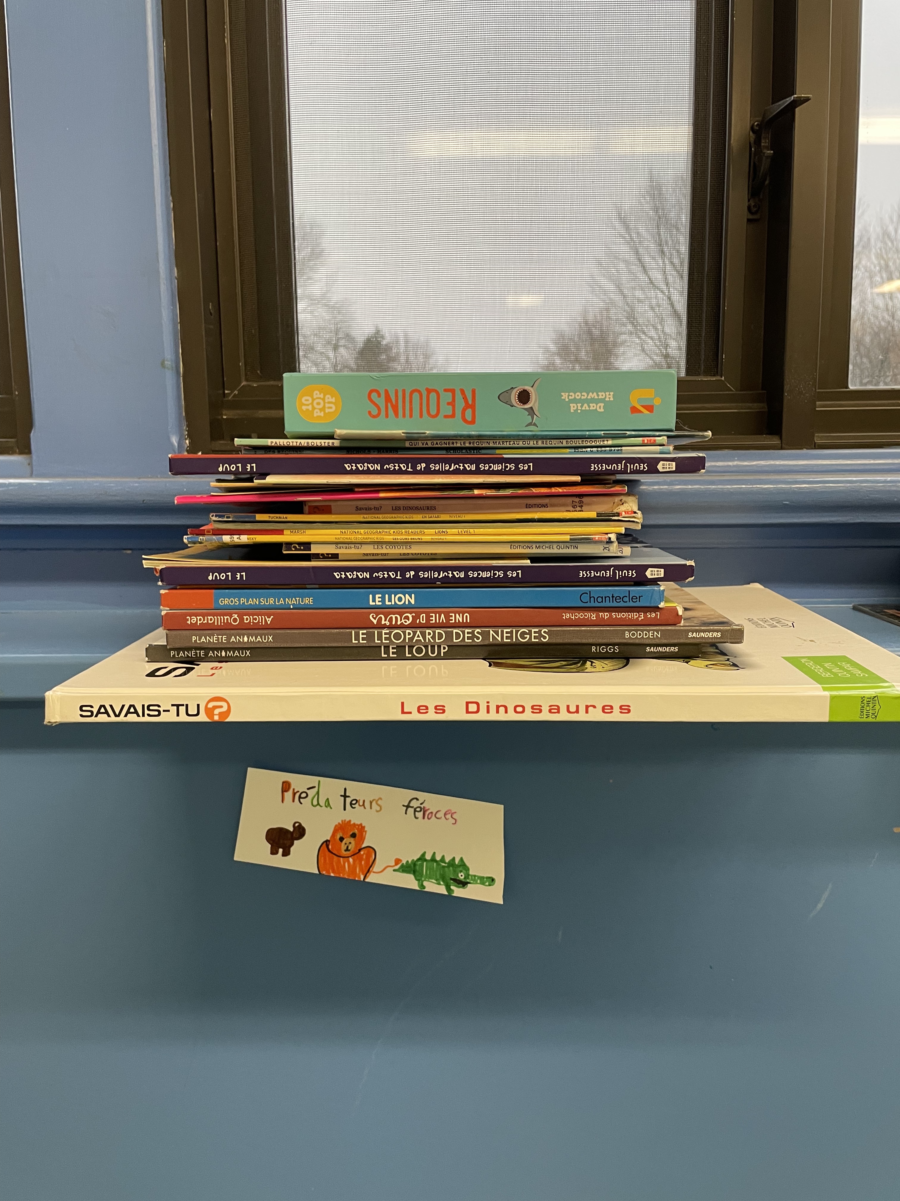 Plus les occasions de manipuler les livres sont fréquentes, plus les élèves les connaissant et les retrouvent facilement. Si l’un d’eux dit à la classe : « Je cherche le livre de Bernadette sur les champignons. », il y a presque toujours un élève qui va lui répondre : « Oh, je l’ai vu dans cette section! » ou « Je l’ai! Je te le prête après? »
