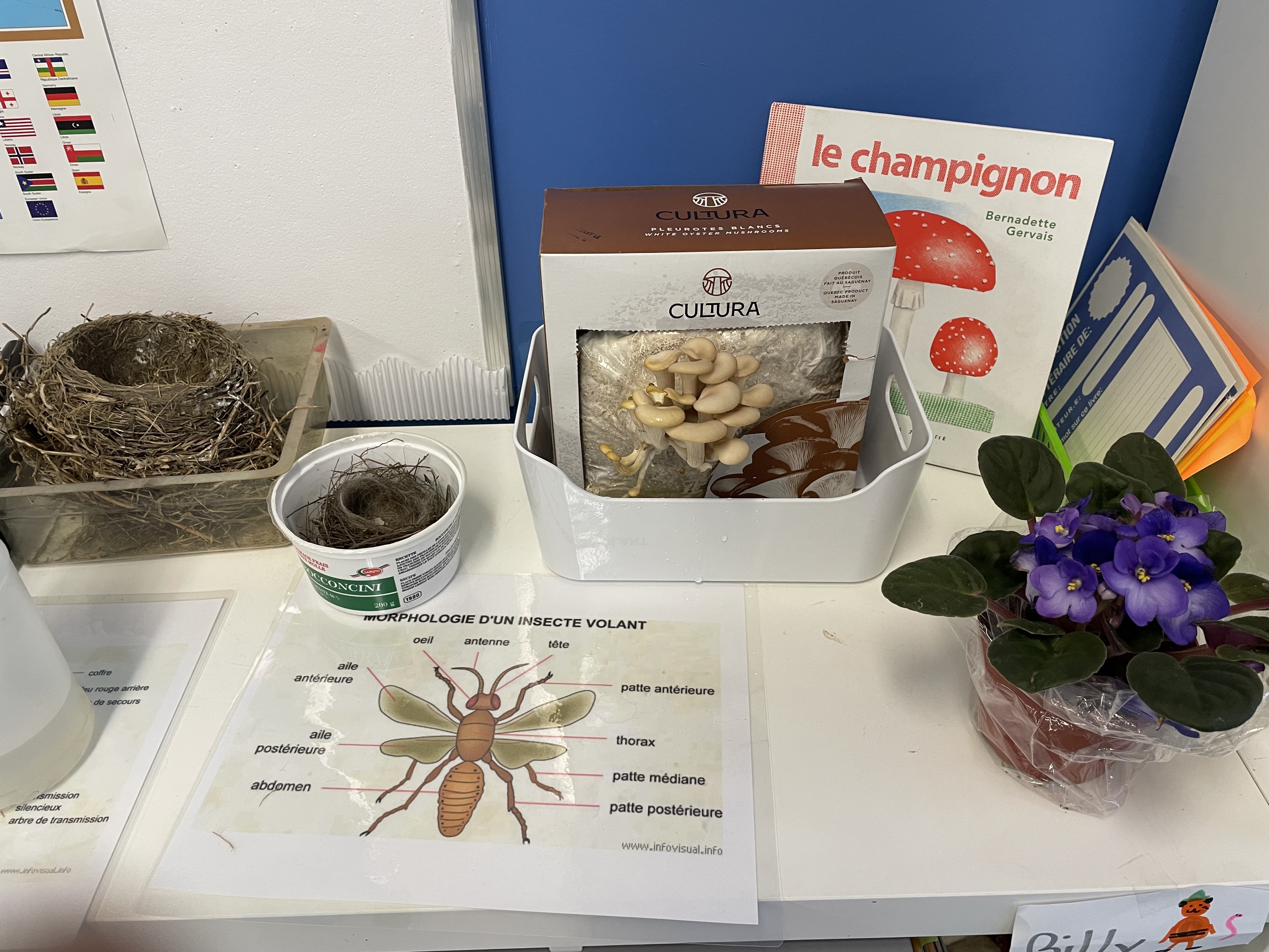 L’environnement de la classe s’est donc transformé. Nous avons créé un espace à proximité de nous pour disposer des objets à observer. On ne pouvait pas ranger ce matériel trop loin, l’envie de découvrir tous ces objets était trop grande. Ce travail d’observation proposé à la première leçon du module est si captivant que nous avons répété l’expérience avec de nouveaux objets à observer. Certains élèves en ont même apporté de la maison et ont partagé leurs connaissances avant de les mettre dans notre coin des curiosités.