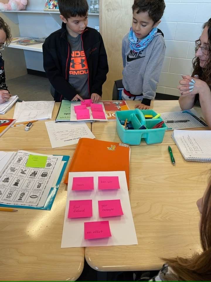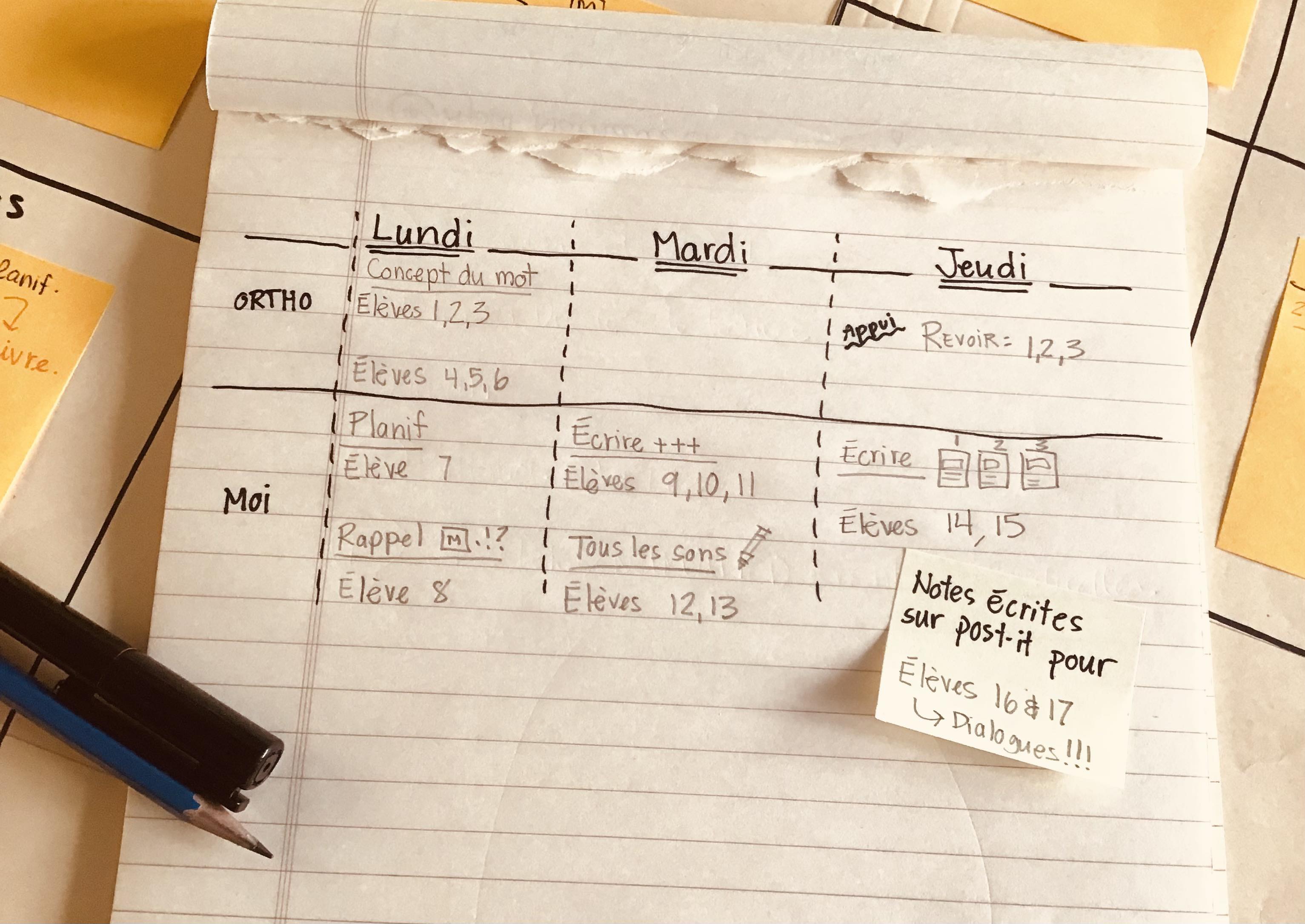 Puis, si tu as la chance d’avoir une collègue qui vient faire une période d’appui, tu places cette dite période pendant les ateliers d’écriture. Tu peux alors assurer le suivi d’un des sous-groupes ayant le plus de besoins une 2e fois dans la même semaine.