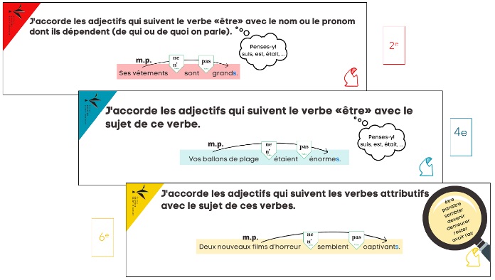 Il ne faisait aucun doute que les visuels devaient être en parfaite cohérence avec ceux utilisés en classe. Nous avions déjà un arrimage dans l’école pour les visuels des manipulations syntaxiques. Pour les autres visuels (par exemple, les outils de l’élève pour chercher l’orthographe de certains mots) nous avons travaillé en étroite collaboration avec tous les enseignants.
