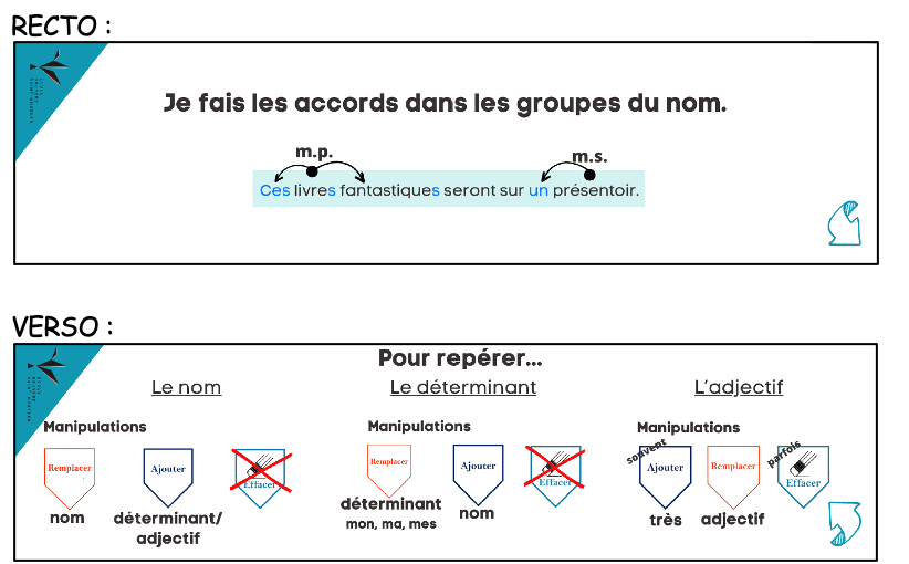 - Les signets nous permettent d’avoir un recto « allégé » et des informations supplémentaires au verso pour ceux qui en ont besoin. Ainsi, si le recto indique de vérifier les accords dans le groupe du nom, mais que l’élève ne se souvient plus des manipulations syntaxiques à utiliser pour bien repérer les classes de mots touchées par ces accords, il peut regarder au verso et avoir des indications supplémentaires pour le faire. Voici un exemple d’un signet de 4e année :