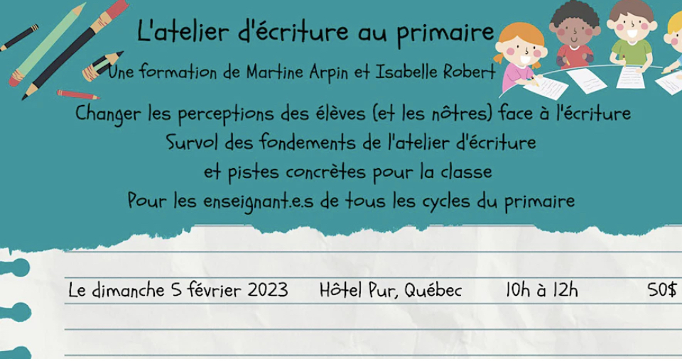 Lors de cet atelier, nous abordons les fondements derrière la philosophie des ateliers d’écriture. Nous faisons un survol des pratiques inhérentes à cette approche. Nous parlerons d’enseignement explicite de l’écriture, de structure de la période d’écriture, des mini-leçons et de rétroaction en cours d’apprentissage, mais aussi des différentes composantes d’un environnement pédagogique riche en littératie. Avec des exemples concrets tirés du vécu en classe avec les élèves.
